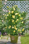 非常に耐病性が強く育てやすい黄バラ。中輪カップ咲きで、枝いっぱいに花を咲かせる姿は見事です。