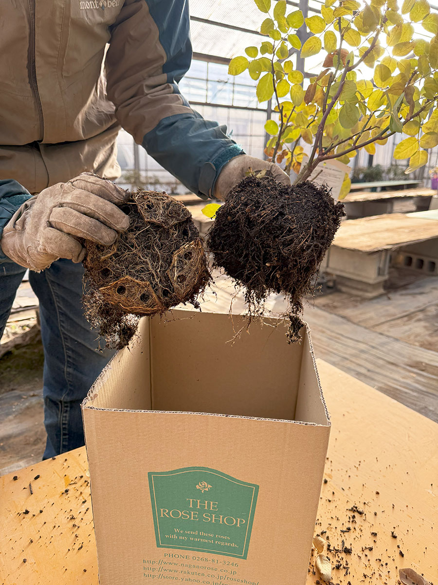 では、持ち上げられないほど大きな鉢で管理しているバラ苗の用土替えはどうしましょう。一度に全ての土を替えることは困難でしょう。その際はケーキの切り分けのイメージで、全体の1/2や1/3を毎冬替えていきましょう。数年で鉢内全ての土がフレッシュになります。