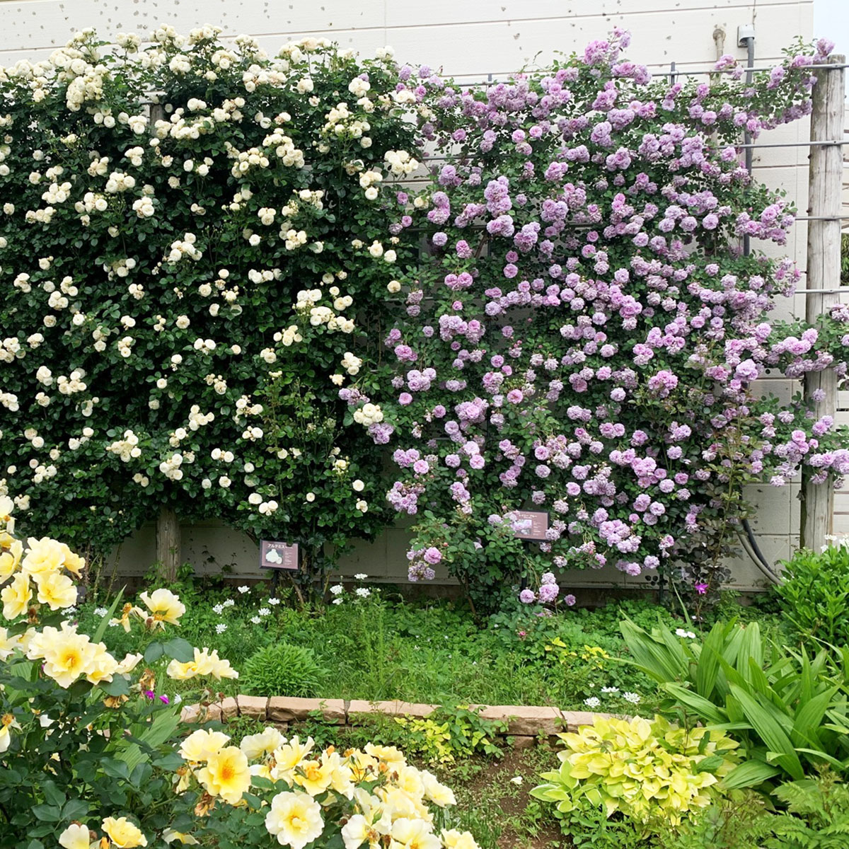 多くのガーデンに採用されていますが、販売元の京成バラ園メインガーデンの壁面は圧巻ですし、寒冷地の軽井沢レイクガーデンのオベリスク仕立ても見事でした。